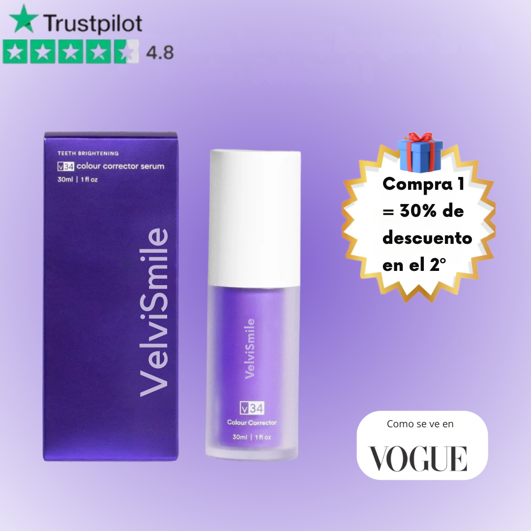 Descubre VelviSmile V34, el revolucionario corrector de color y la solución perfecta para eliminar las manchas amarillas y revelar una sonrisa radiante al instante. Gracias a su innovadora tecnología morada, neutraliza la decoloración sin peróxido, ofreciendo resultados rápidos y naturales mientras cuida tus dientes.
